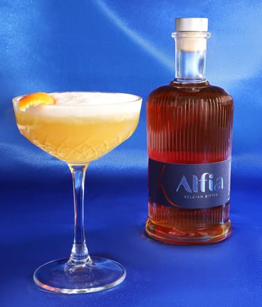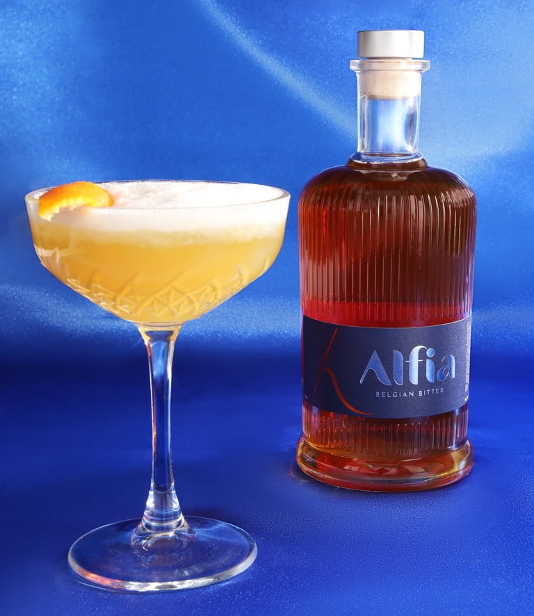 Pour 30 ml Alfia Belgian Bitter in the glass, followed by the Belgian juniper and the vermouth